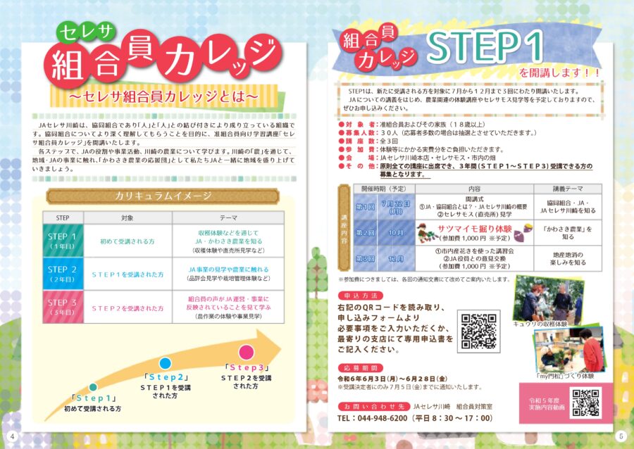 同講座では、STEP1~3の各ステップでJAの役割や事業活動、川崎の農業について学んでもらい、協同組合への理解を深めていただいています。