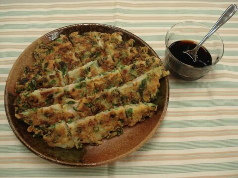 - 焼き上ったら食べやすい大きさに切り、混ぜ合せたしょうゆと酢のつけダレを、チヂミに添える。