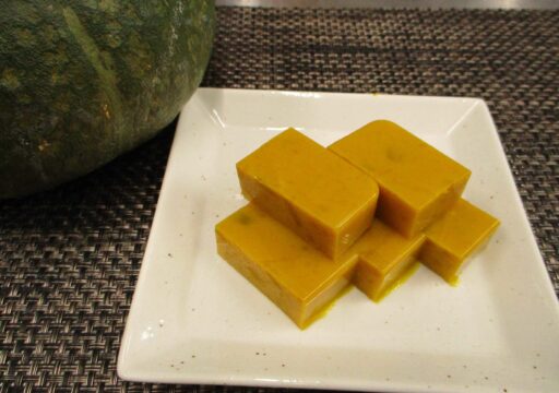 - かぼちゃの種とワタ、皮を取り除き1cm角に切り電子レンジにかけ3~5分ほど加熱して柔らかくします。