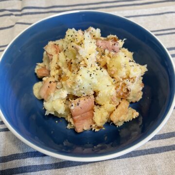 - ジャガイモは皮を剥き、ラップで包み600wのレンジで6分ほど加熱する。加熱後、大きめのボウルに移して粗めにつぶす。