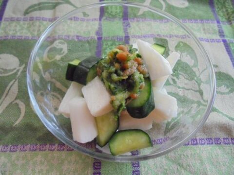 - 長芋とキュウリの水気をキッチンペーパーで取り、(4)とかつおぶしで和えてできあがり。 *キュウリの水気が出やすいので、和えるのは食べる直前がおすすめです。