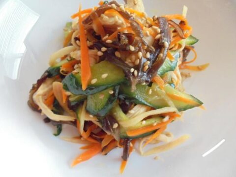 - きくらげをサッと茹でて千切りにする。