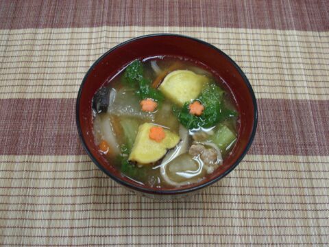 - ダイコンが透き通ってきたら、ほぐしたきのこと、一口大に切った白菜ぬき菜を入れ、かつおだしを加える。火を止めてから味噌を入れ、やや薄味に味を調える。