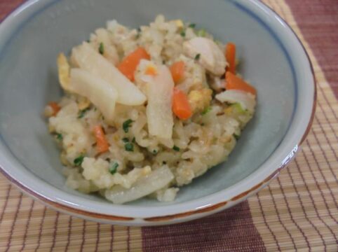 - 炊き上がったら大根葉、ゴマを混ぜて出来上がり。