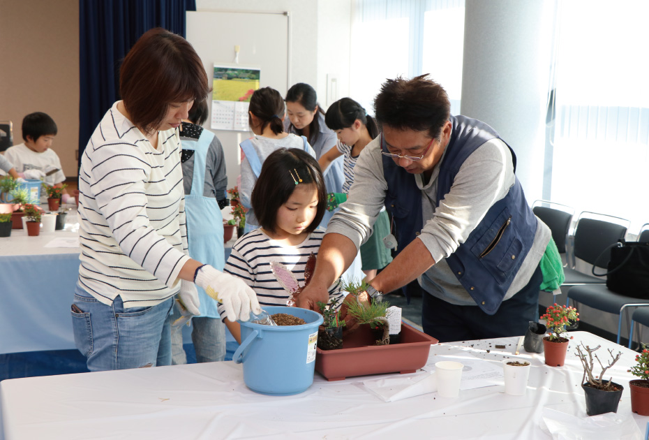 植木盆栽部は、植木の生産・造園業・小売りをしている人たちで構成されている組織で、知識を高める講習会や視察研修会の開催、各種品評会への出品を行っています。また、地域の小学生を対象とした「親子ミニ盆栽教室」の開催や市民に緑を提供する取り組みなど、地域貢献活動も展開しています。