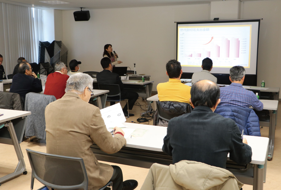 花卉部は、切花・枝物・鉢物・ポット物と多岐にわたる生産者で構成されています。生産技術の向上を目的とした立毛共進会や品評会への出品のほか、各支部では市民に向けたPR活動の一環として、寄せ植え教室や生け込みを行っています。伝統ある高品質な花卉栽培を行いながらも、新たな生産技術の習得のため研修会や講習会、研究会も定期的に開催しており、生産された花卉は各品評会で農林水産大臣賞等を受賞しています。