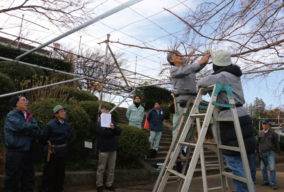 果樹部は、古くから栽培している多摩川梨や柿、ブルーベリー、ブドウ、カンキツ、梅、イチジクなどを栽培している生産者で構成されています。主な活動としては、生産技術の向上を目的とした立毛共進会や品評会への出品の他、講習会を開催しています。また、総合的病害虫管理(IPM)を活用した環境保全型農業にも取り組んでいます。