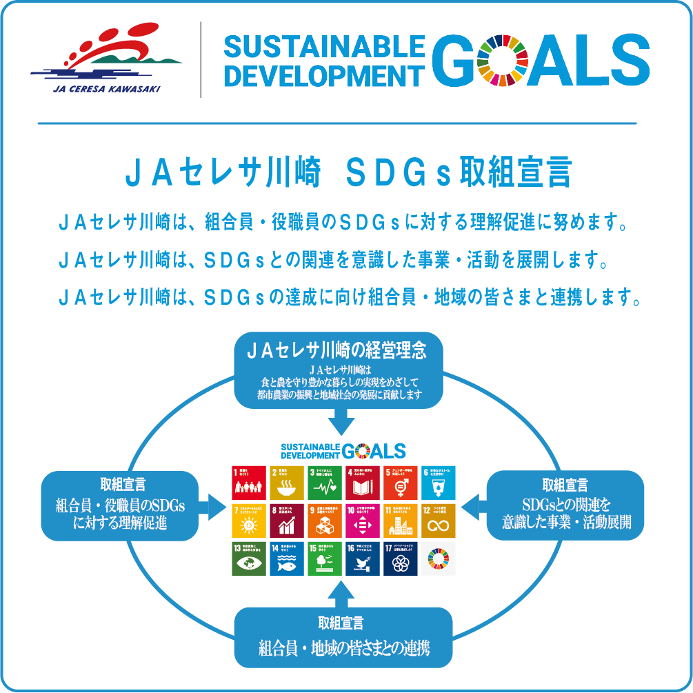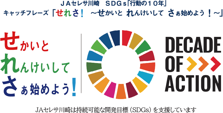 JAセレサ川崎は、組合員をはじめとする地域の皆さまや、JAグループと連携し、SDGsの達成に向けた取り組みを進めてまいります。