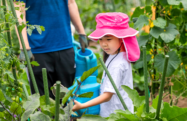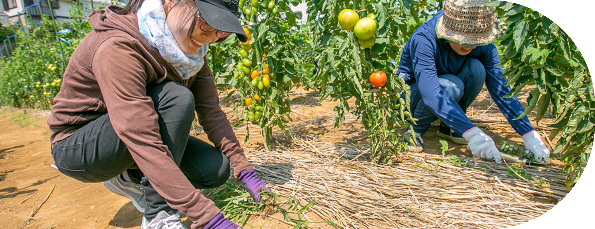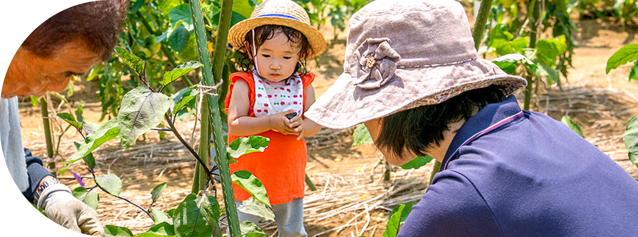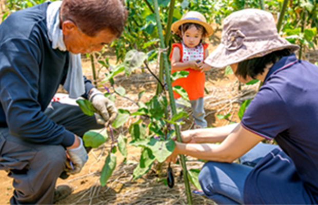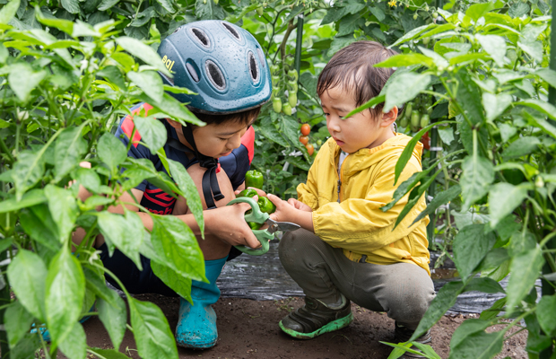 農薬を抑えた栽培方法で自分で作るから、安心・おいしい太陽のもと元気に農作業をして適度な運動に。