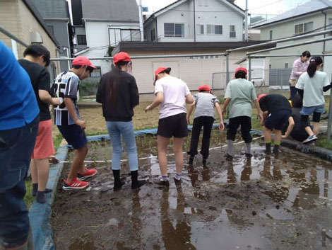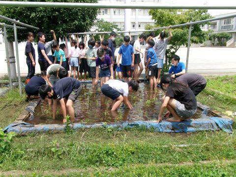 高津小学校では5年生を対象に校内にある田んぼを使い稲作体験を実施しました。