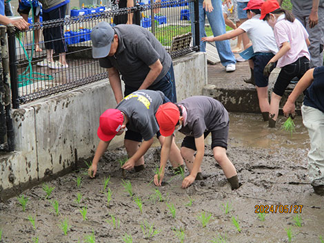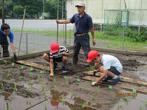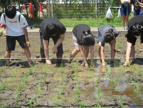 井田小学校では5年生を対象に校内の田んぼを利用して、地元農家の指導のもと稲作体験学習を実施し、児童たちは田起こしから脱穀までの作業を体験しました。田植えでは苗の持ち方・植え方を教えてもらい、丁寧に苗を植えました。