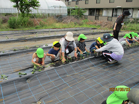 サツマイモの定植では「大きくなーれ」・「おいしいお芋になーれ」と願いを込めて苗を植えました。