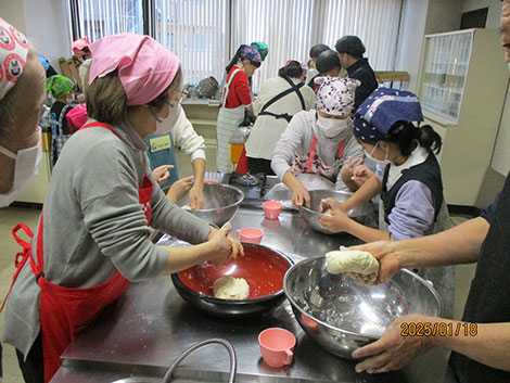 中原地区では中原地区在住の小学生と保護者を対象とした親子料理教室を開催しました。今回はうどん作りにチャレンジし、「ふるさと生活技術指導士の会」の方の指導のもと、混ぜて・こねて・踏んでおいしいうどんができました。