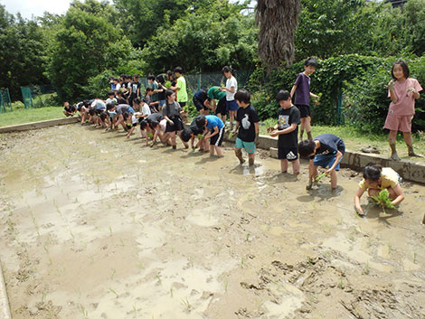 下布田小学校では、校内にあるプールを利用し、稲作体験を毎年行っています。