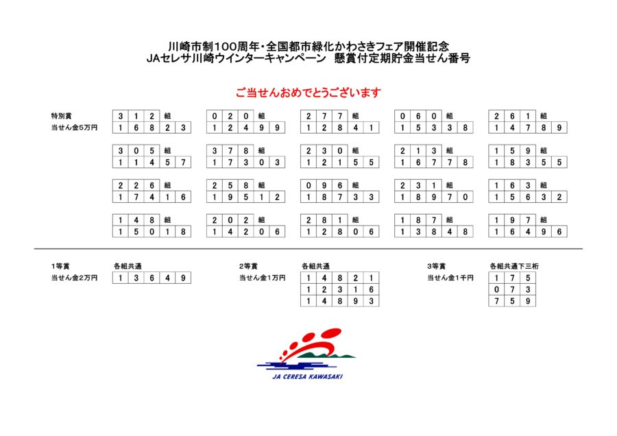 川崎市制100周年・全国都市緑化かわさきフェア開催記念 JAセレサ川崎ウインターキャンペーン抽せん結果について