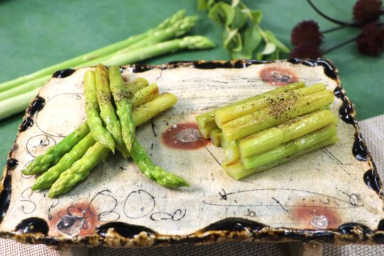 旬を迎えたアスパラガス本来の甘みや旨み、香りをシンプルに味わえる一品です。直売所の新鮮なアスパラガスは根元のほうまでやわらかいのが魅力。塩は、粗塩をおすすめです。ガーリックバターやバター醤油、粉チーズなどでアレンジも楽しめます。
