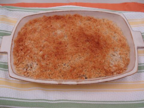 - 耐熱皿に具を敷きつめてパン粉をのせてオーブンで焼き色がつくまで焼く。(200℃のオーブンで10~15分くらい)