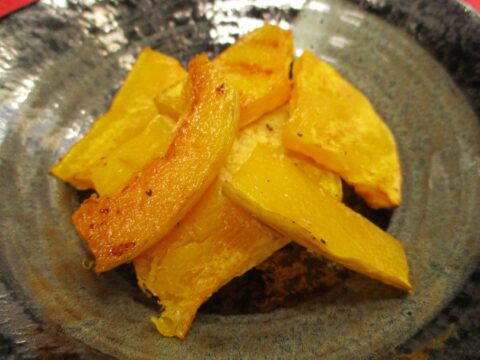 - カボチャは5ミリくらいの厚さにスライスする。 (皮は薄く、皮付きでもお召し上がりいただけます。)