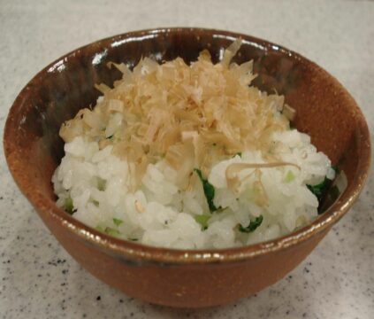 - 炊き上がったご飯に水気を切った適量の大根葉とちりめんじゃこ、ゴマを混ぜ茶碗に盛って鰹節をかける。