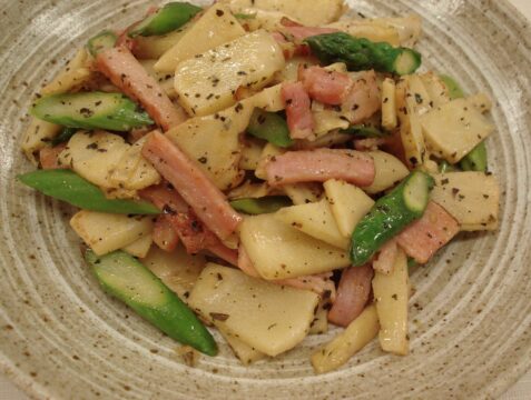 - たけのこは約5センチに、アスパラガスは斜め薄切り、ベーコンは細切りに切る。