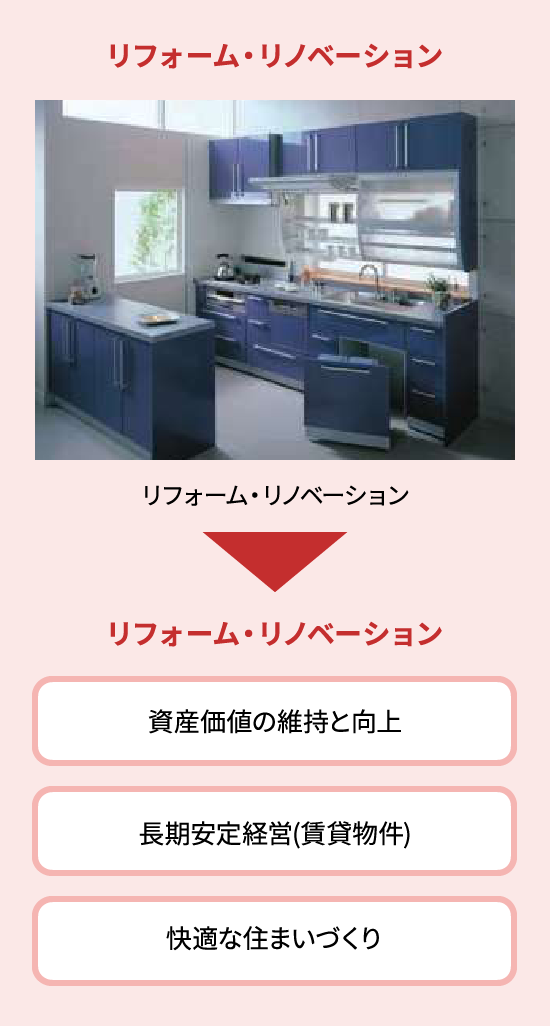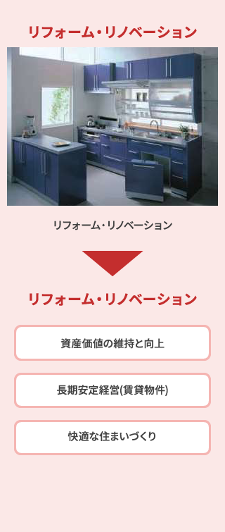 既存の土地活用物件(アパート・マンション・テナント等)に対して、資産価値の維持・向上と事業の長期安定経営を目的に、外装塗装・屋上防水から間取りの変更まで、さまざまなご要望にお応えいたします。