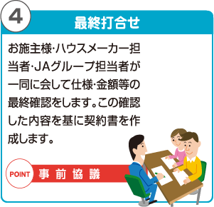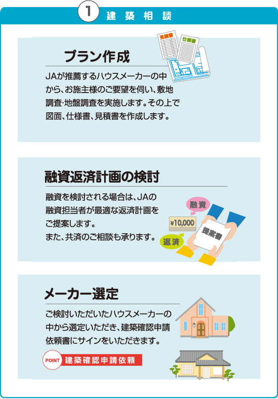 「施主代行方式」とは、ご相談からアフターサービスまで、施主さまが直面される不安や問題を施主さまの立場で解決するJAグループ独自のシステムです。