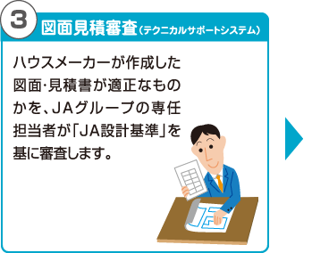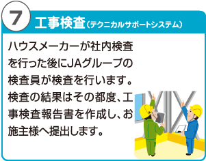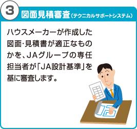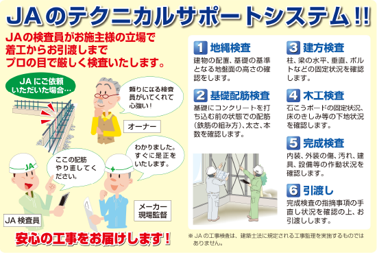 物件ごとに適切な設計・見積もりかどうかをJAグループの専任技術者が審査します。現場で施工が始まると、メーカー社内検査・工事監理とは別の立場で検査します。