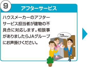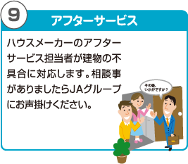 建物の不具合など、ご相談ごとがありましたらお気軽にJAにご相談ください。建築業者のアフターサービス担当者とともにご対応いたします。