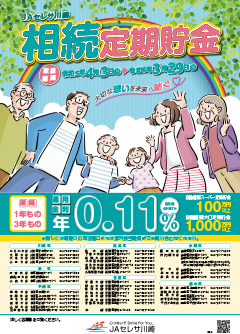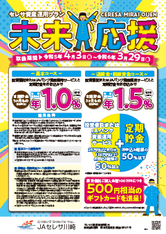 金融機関(当JA以外の金融機関を含む)での相続手続完了後1年以内に、相続により取得した資金を原資としてお預け入れいただける個人の方に限り、金利を上乗せしてお預かりする定期貯金です。セレサ資産運用プラン定期貯金(未来応援)〈退職金・相続資金・他行預替資金コース〉もご利用いただけます。