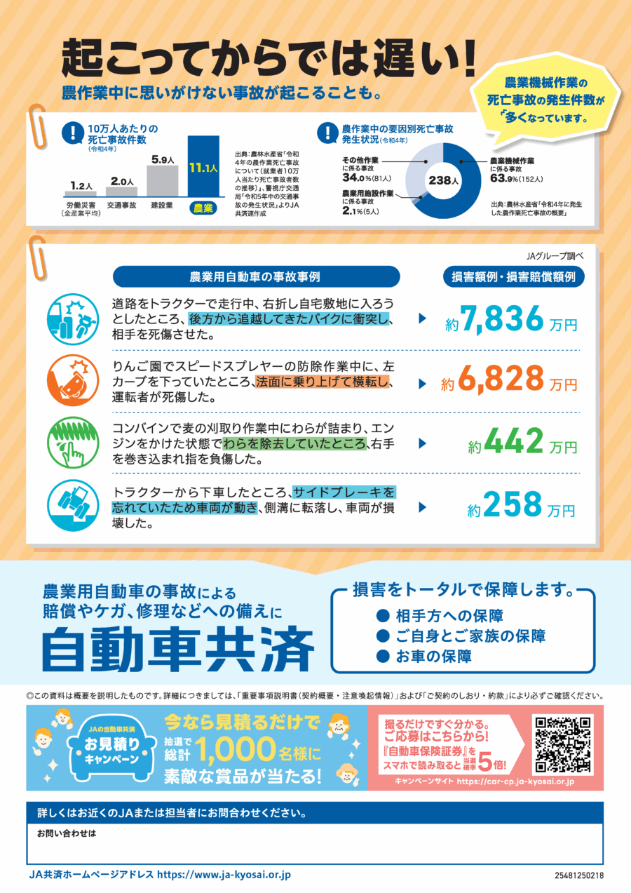 農作業のなかでも特に事故の多いとされる農業用自動車・刈払機(草刈機)について、使用の際に潜むリスクとそれに備えるための自動車共済をご案内します。