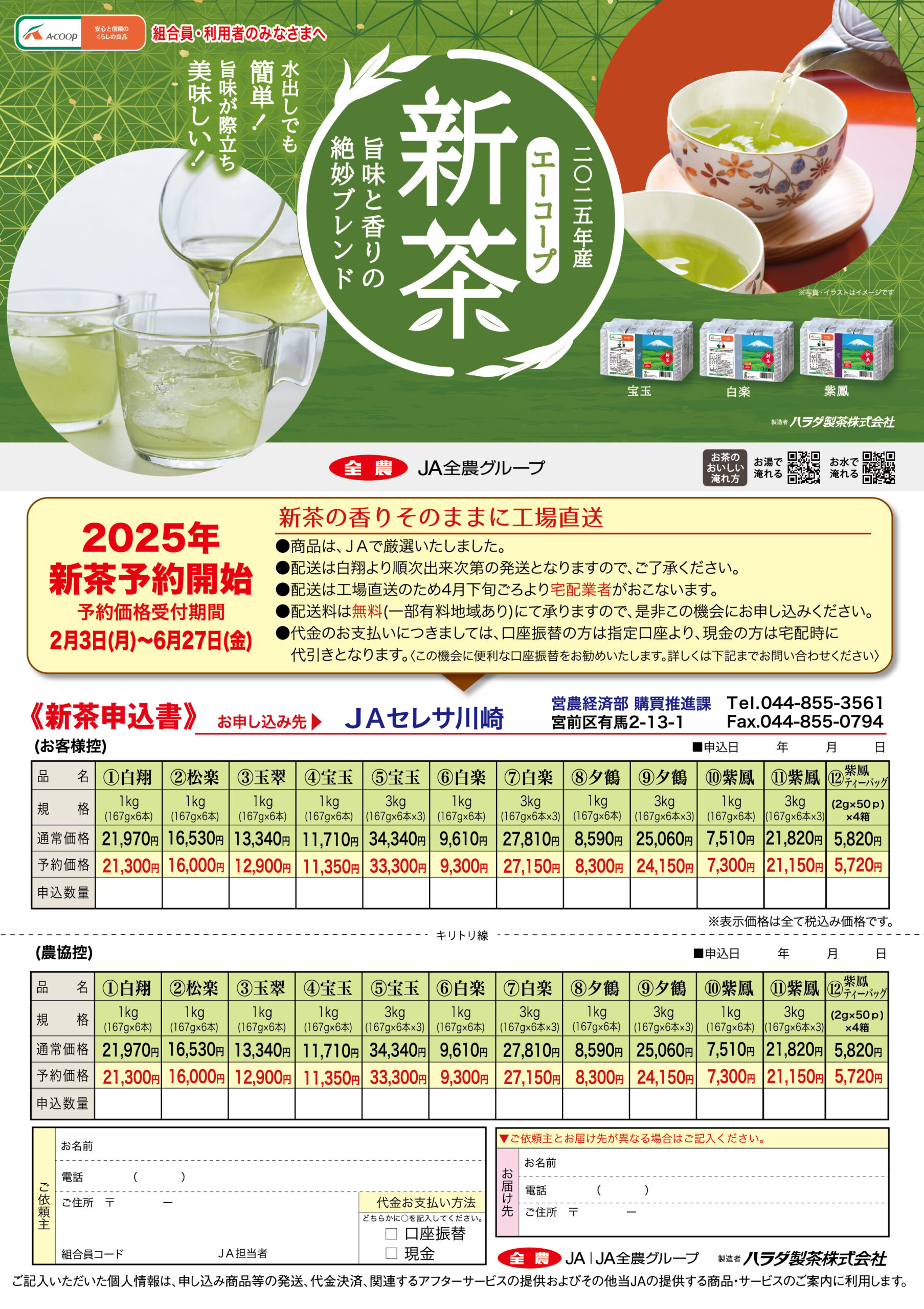 JAセレサ川崎では、春の香り豊かな新茶を特別価格にてご提供いたします。